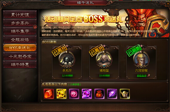 活动规则:活动期间内在野外击杀怪物后有几率获得端午集字道具,集齐指定数量道具后即可在端午集字活动中兑换集字奖励