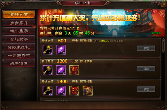 活动规则:活动期间内累计充值达到指定额度即可领取一份充值奖励
