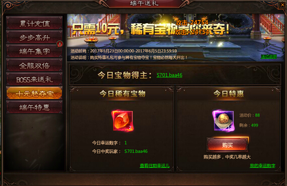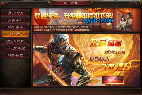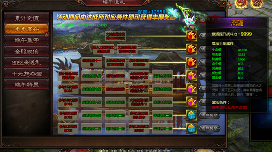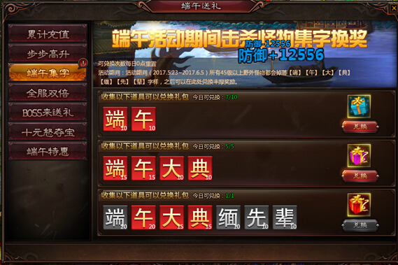 活动规则:活动期间内在野外击杀怪物后有几率获得端午集字道具,集齐指定数量道具后即可在端午集字活动中兑换集字奖励